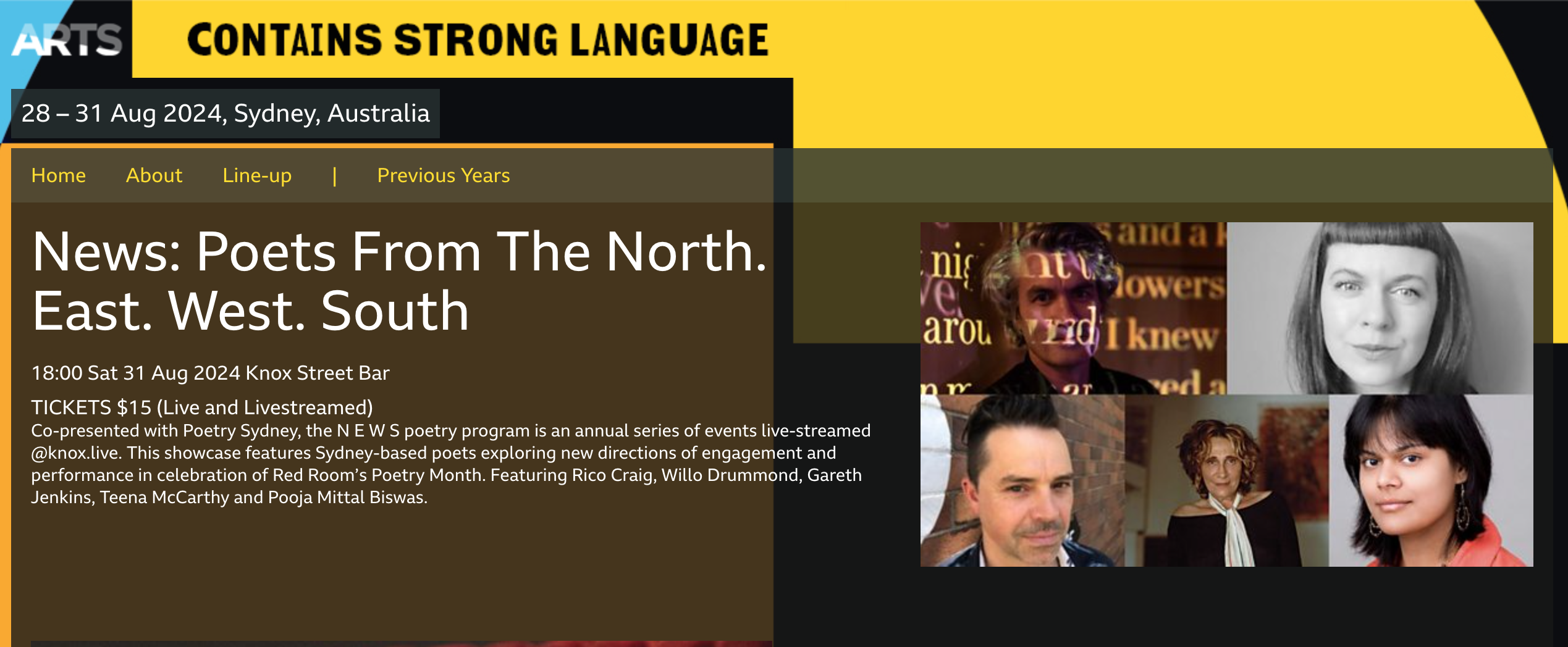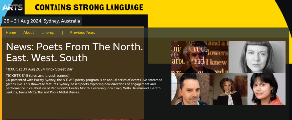 NSW: Contains Strong Language. I’m over the moon to be appearing in a very special iteration of Poetry Sydney’s NEWS. Poets from the North. East. West. South, as part of the BBC’s Contains Strong Language Festival. In collaboration with Red Room Poetry, the UK’s biggest poetry and performance festival for new writing is leaving British shores for the first time in its eight years, to put a spotlight on Australia from 28th to 31st August 2024. NEWS will be live and live-streamed from Knox Street Bar, Chippendale, from 6:00 PM on Saturday 31st August. Tickets here.