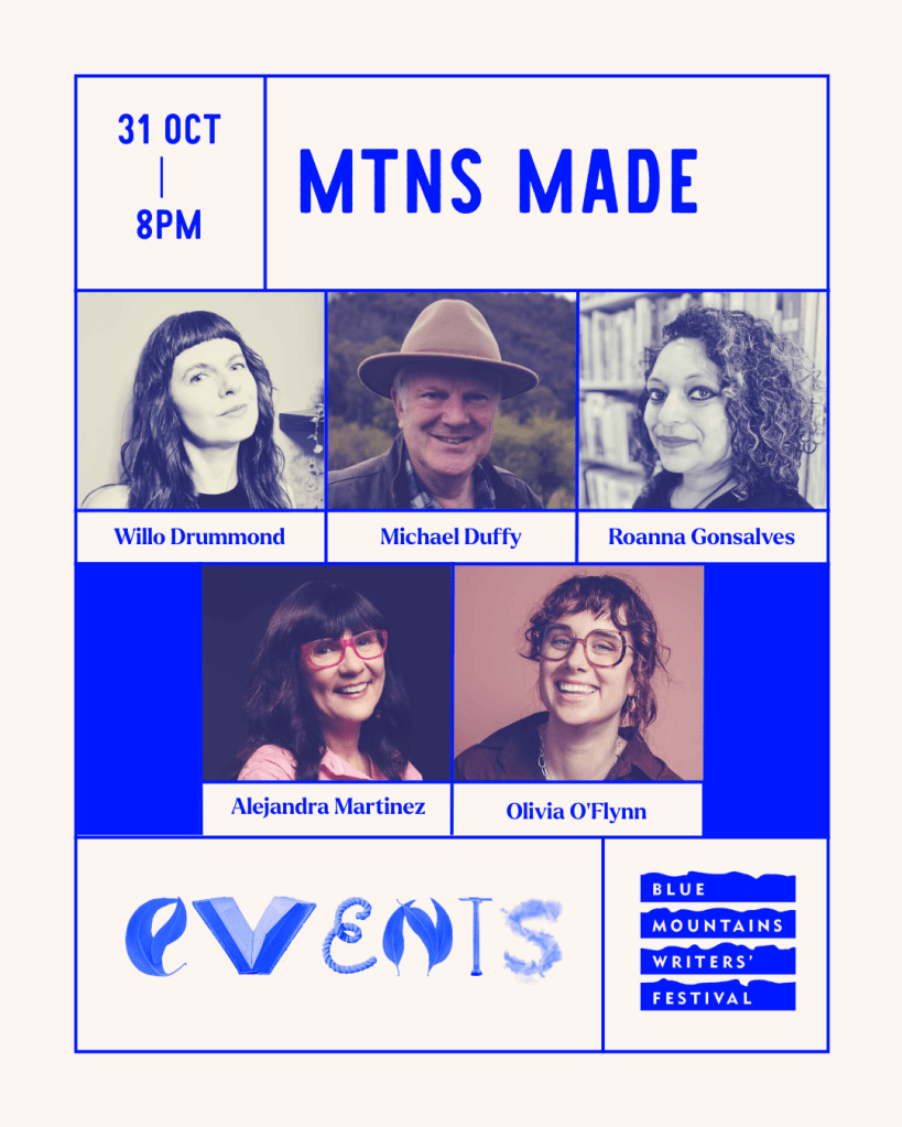 Friday 31 October, 8:00 pm to 9:00 pm, MTNS MADE: Readings from Michael Duffy, Roanna Gonsalves, Alejandra Martinez, Olivia O’Flynn and myself. The Ballroom at The Carrington Hotel. Tickets here.